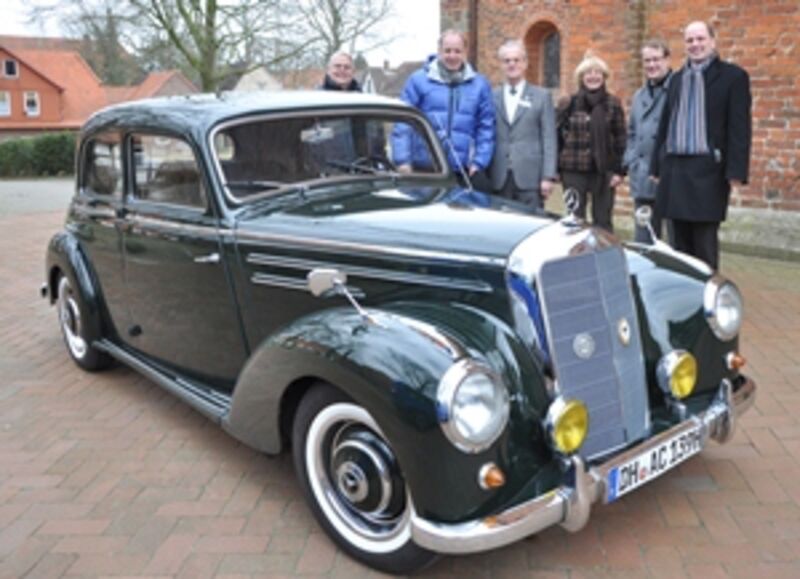 Der Bischof fand den Mercedes aus den 50er Jahren „zum Niederknien“ und schaute sich auch den Unterboden und den Motor an. Das Fahrzeug brachte den Oldtimer-Kenner zum traditionsreichen Stift in Bassum und Pastoren und Kirchenvorsteher zeigten ihm natürlich auch die Stiftskirche mit dem berühmten Gipsfußboden.